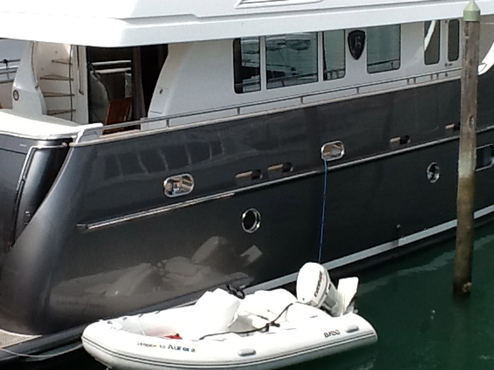 One of the many, many vessels protected by the bollards....several of them had this grey steel polished gelcoat on the bottom....so shiny that it reflected whatever was next to it. To my (Kathy's) eye, much prettier than the dull white, green, blue or brown.